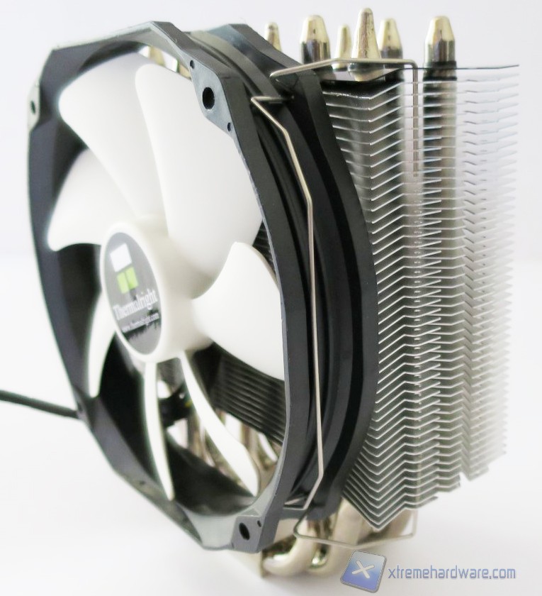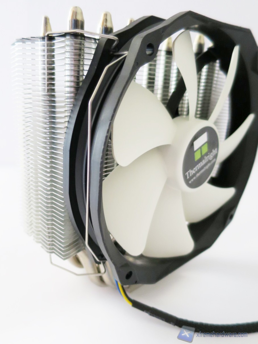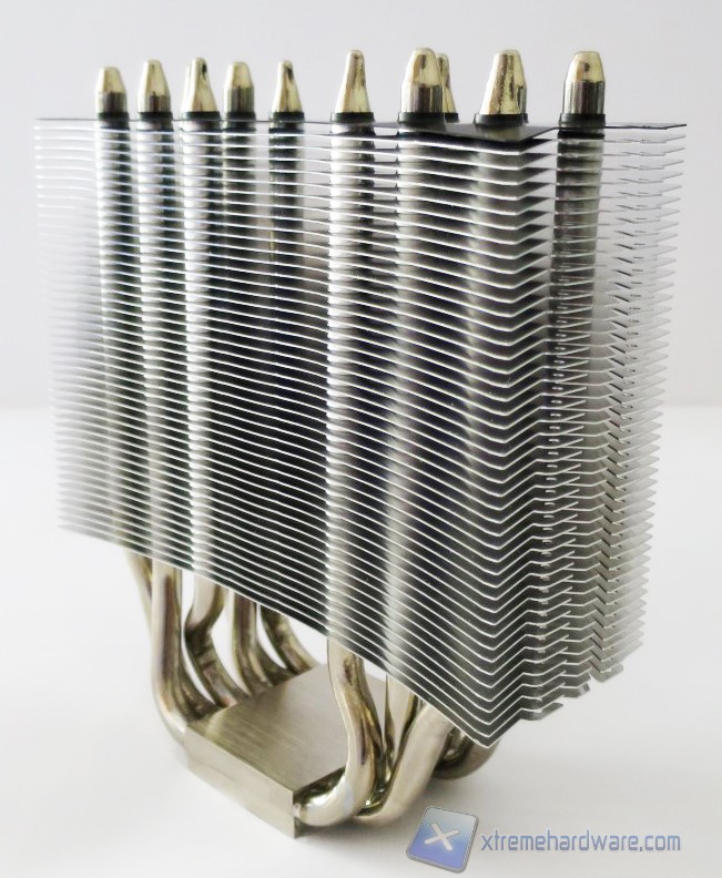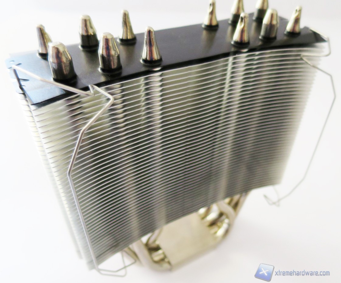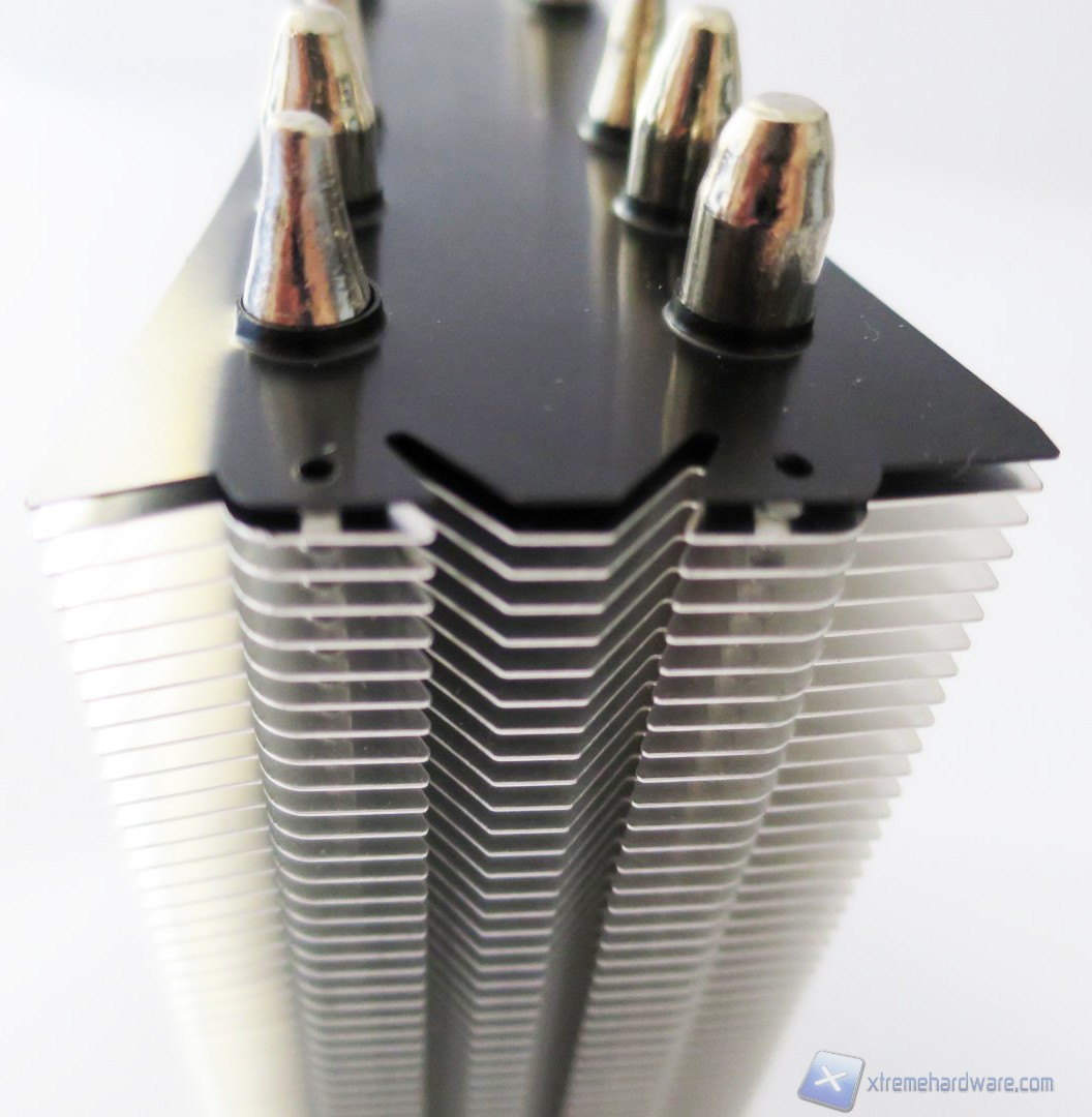 Abbiamo già accennato alle dimensioni e alla superfice dissipante di questo immenso dissipatore a torre. Analizzando nel dettaglio il comparto lamellare notiamo la presenza di ben 46 lamelle non punzonate e ottimamente rifinite alle quali è stato praticato un foro agli estremi in modo per inserire con facilità la clip della ventola. Ciò garantisce anche una maggiore solidità strutturale nonché una pulizia nell’installazione. Tale accorgimento permette inoltre di ridurre lo spazio occupato dalle clip per sorreggere la ventola. Thermalright che come ormai sappiamo punta alle massime prestazioni ha pensato bene anche di includere nel ricco bundle un’ulteriore coppia di clip in metallo per permettere di creare sul dissipatore una configurazione Push Pull in modo da aumentare ulteriormente le prestazioni. Inoltre, la possibilità di montare anche ventole da 120 millimetri permette una completa customizzazione del dissipatore scegliendo magari le ventole che più ci piacciono o che riteniamo più prestanti. Le caratteristiche del True Spirit 140 Power non terminano qui e notiamo dunque ben 6 heatpipe da 8 millimetri ciascuna in rame con rivestimento in nickel che assicureranno un adeguato scambio termico anche con CPU in Overclock. Il True Spirit 140 Power infatti differisce anche per questa caratteristica (non solo per lo schema di colori) dal True Spirit 140 base. Inoltre analizzando nel dettaglio la disposizione delle heatpipe notiamo come queste siano disposte in due blocchi da 3 e non una allineata all’altra. Le heatpipe terminano nel top del dissipatore con una forma bombata e ben rifinita. Notiamo la cura per i dettagli anche da questa prima lamella completamente verniciata di nero opaco e sulla quale è stato inciso logo del brand. Altra piccola caratteristica è la leggera pendenza verso il basso degli angoli destro e opposto sinistro delle lamelle in alluminio, per convogliare meglio il flusso d’aria.