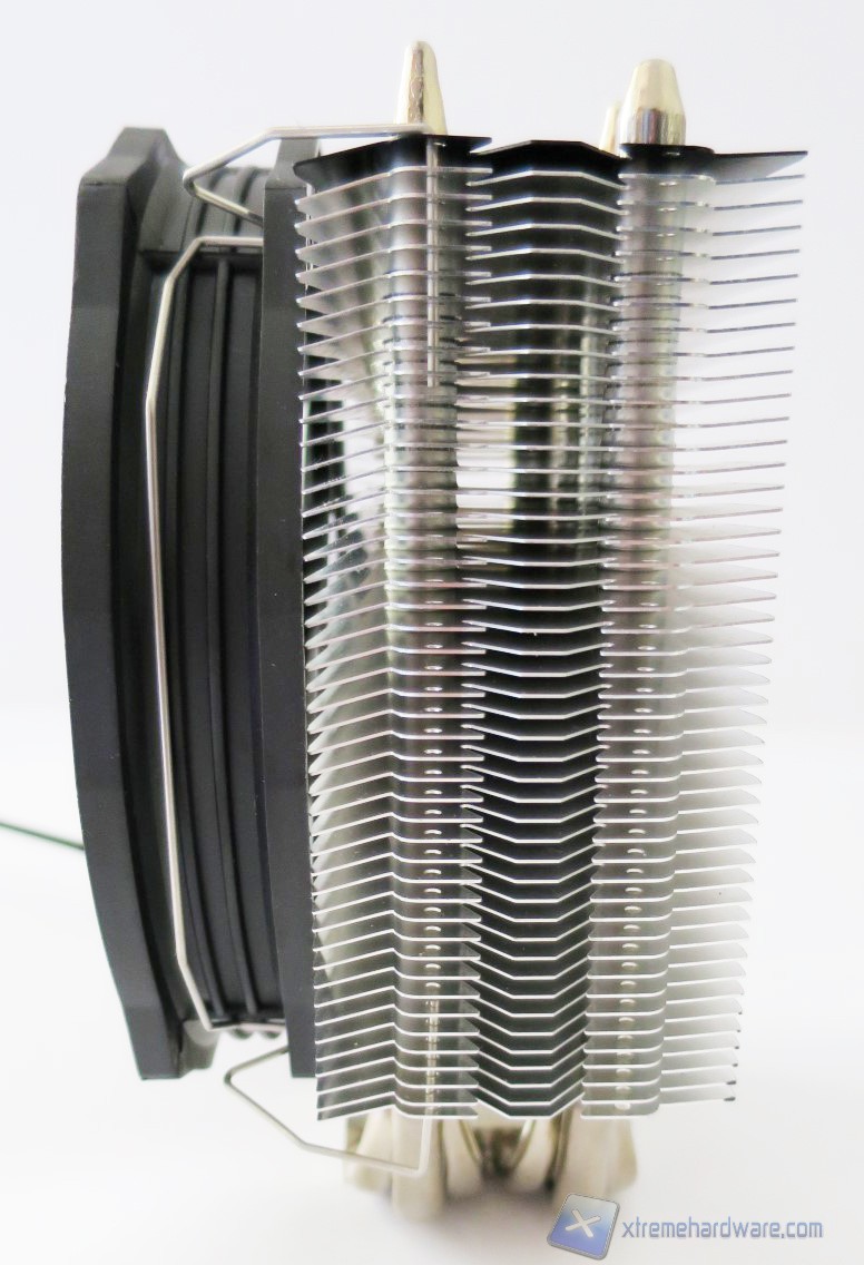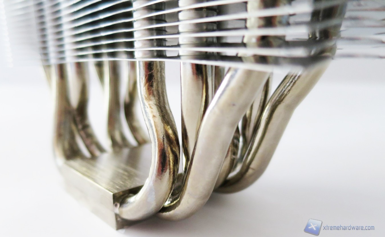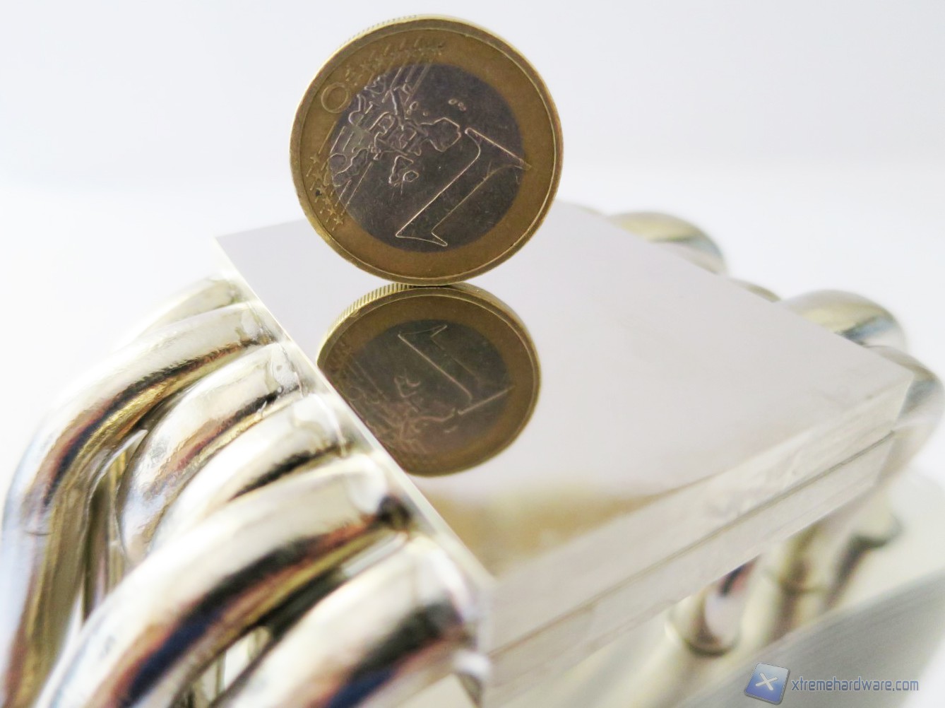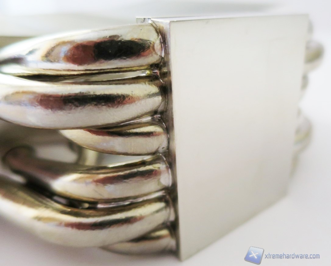 Analizzando la base di contatto notiamo come questa sia stata trattata e resa a specchio per massimizzare lo scambio termico con la CPU. Le dimensioni del blocco di contatto, in alluminio, sono generose e questo permette anche un più rapido e migliore scambio termico. Inoltre la base di contatto non utilizza la tecnologia HDT (Heat-pipe direct touch) ma si affida a delle heatipe che attraversano internamente la base di contatto. Questa scelta per certi versi è anche migliore in quanto permette di avere una base di contatto più vasta e planare rispetto ad un dissipatore HDT dove sono presenti comunque degli interstizi che potrebbero creare delle discrepanze nello scambio termico.