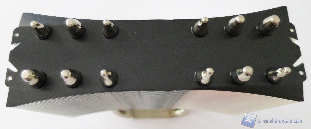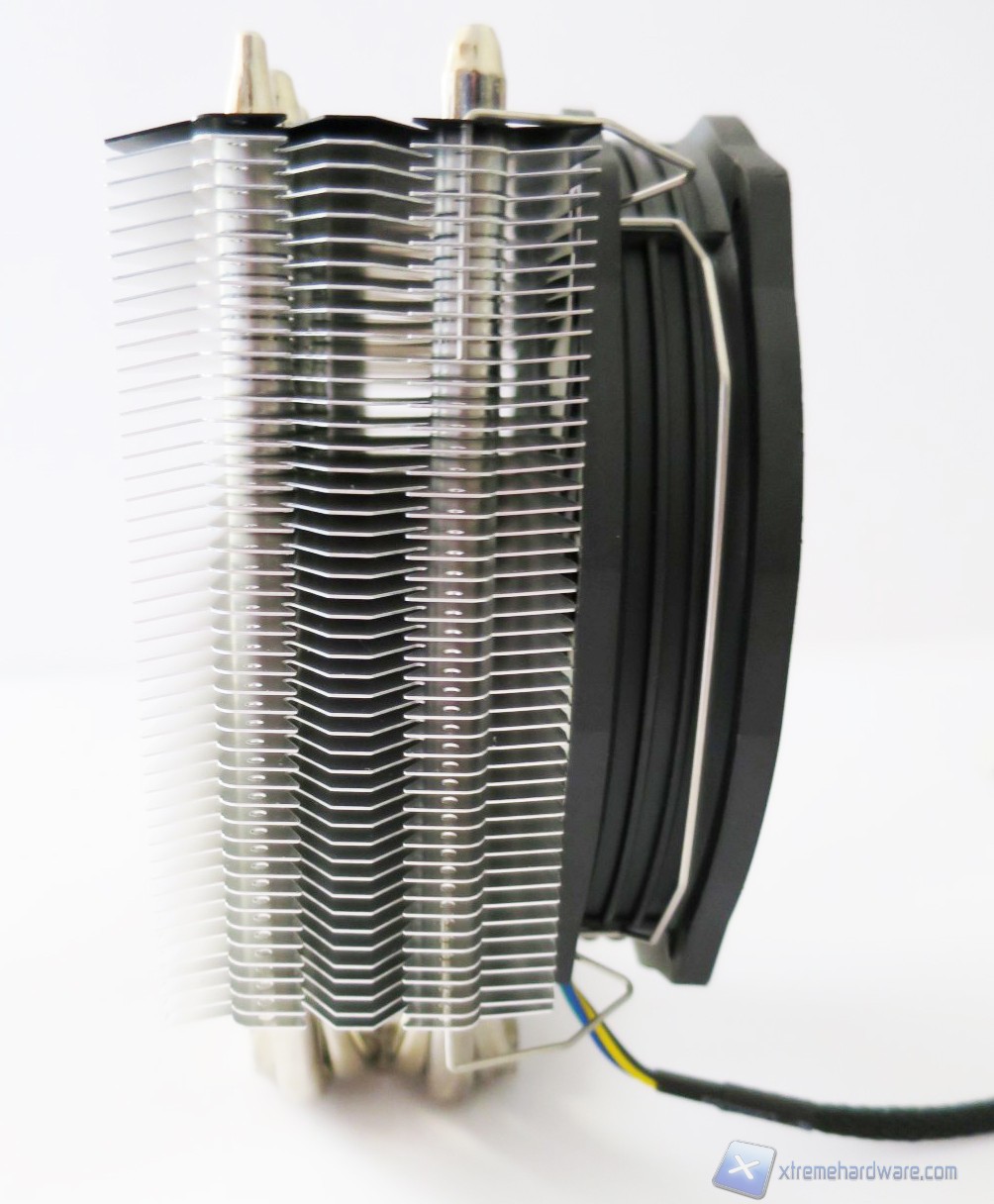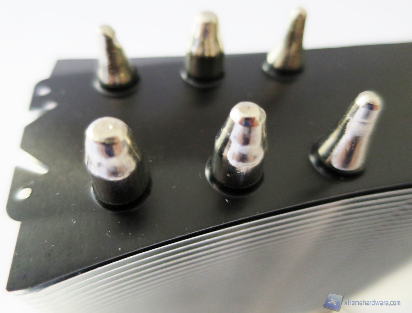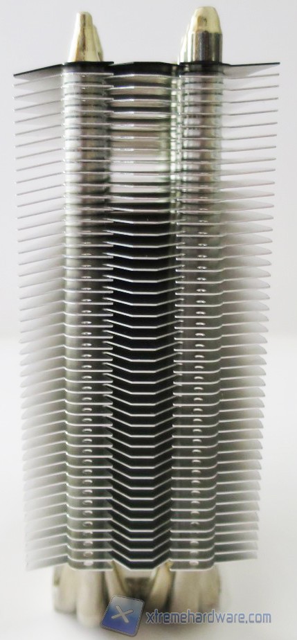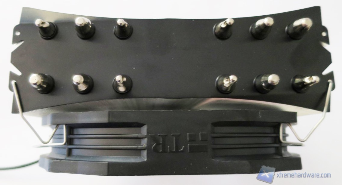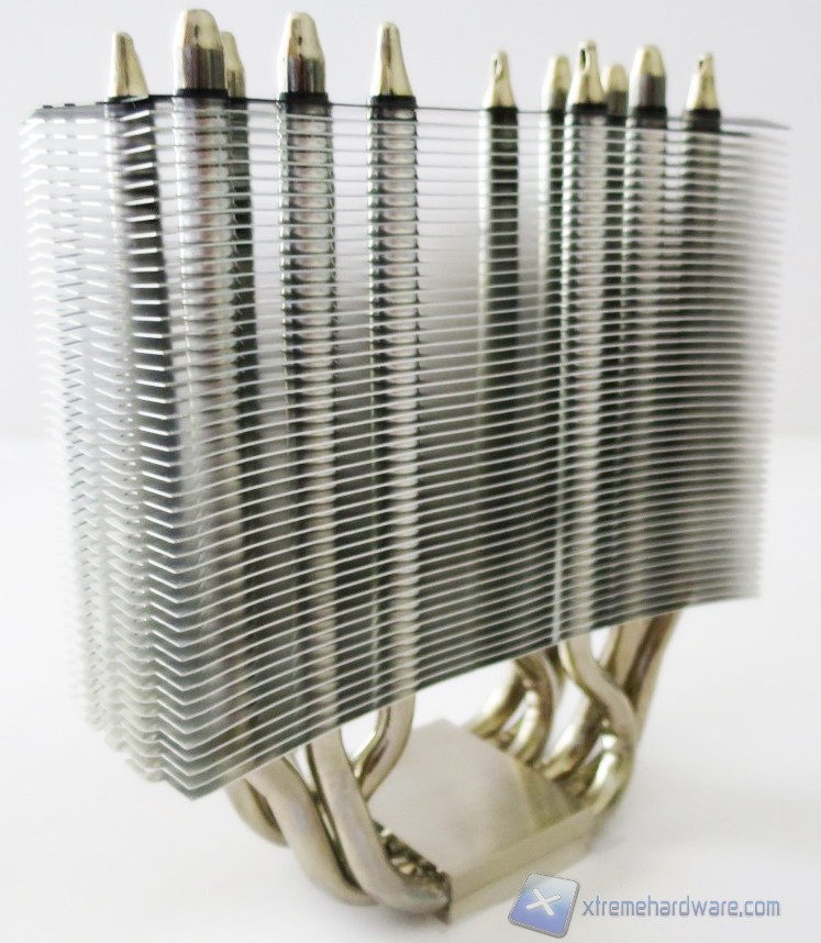 Analizzando la base di contatto notiamo come questa sia stata trattata e resa a specchio per massimizzare lo scambio termico con la CPU. Le dimensioni del blocco di contatto, in alluminio, sono generose e questo permette anche un più rapido e migliore scambio termico. Inoltre la base di contatto non utilizza la tecnologia HDT (Heat-pipe direct touch) ma si affida a delle heatipe che attraversano internamente la base di contatto. Questa scelta per certi versi è anche migliore in quanto permette di avere una base di contatto più vasta e planare rispetto ad un dissipatore HDT dove sono presenti comunque degli interstizi che potrebbero creare delle discrepanze nello scambio termico.