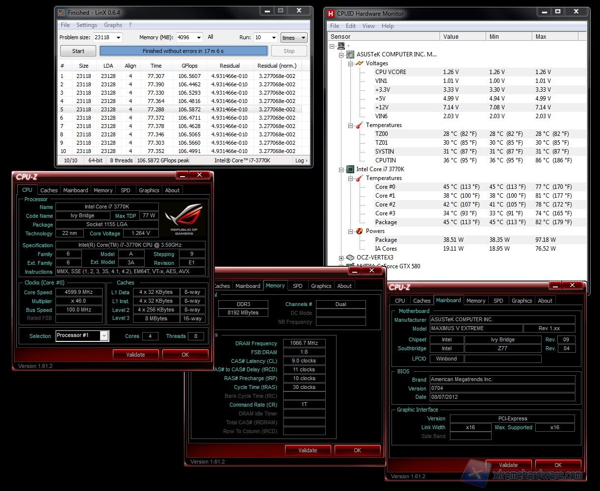 A titolo di comparazione con Core i7-3770K siamo riusciti a chiudere alla frequenza di 4600 MHz sempre utilizzando LinX un valore di 106,5872 GFlops impostando la frequenza delle RAM a 2133MHz.